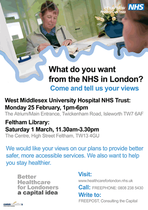 Hounslow Primary Care Trust is encouraging patients, residents, commuters, representative groups, unions, electoral representatives, staff and anyone who has an interest in, or might use, London health services to have their say.