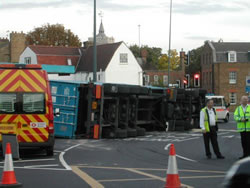 The lorry was on the eastern side of the roundabout in the section between the eastbound and westbound A4 carriageways so the A4 was not totally obstructed. However, if you were travelling east on the A4, it was not possible to turn right around the roundabout into Church Street or down the A316 south to Chiswick Bridge (except for buses).