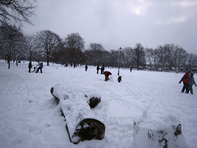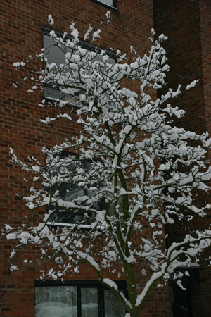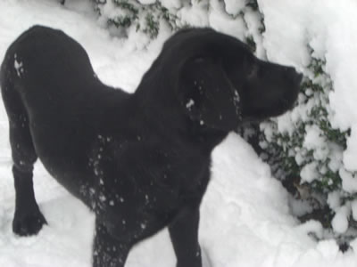 | First snow for this puppy! | Last nights snowman gets buried overnight! |