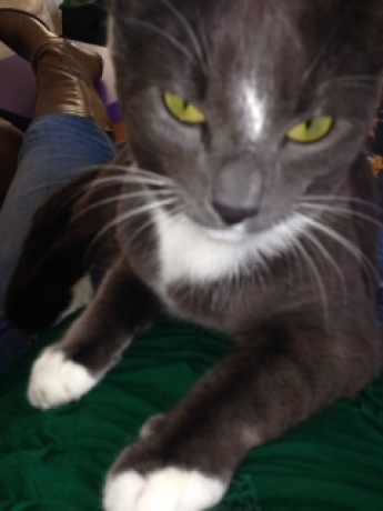 Please check your cuboards and wardrobes. She may also be in outside buildings like sheds or greenhouses. It is very unlike her not to come home when called. She is mainly grey, with a white bib and paws and with a flash of white in-between her eyes She was wearing a purple diamonte collar. She is smaller than the average cat."